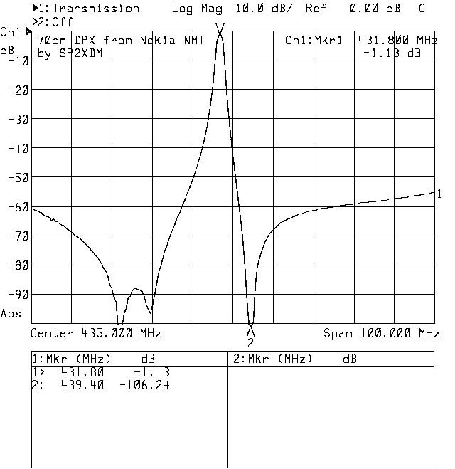 Ponieważ próby z filtrami ćwierćfalowymi, pozyskanymi ze złomowanych stacji NMT 450, a dokładniej ich bloków nadawczych typu TPA 31, przyniosły obiecujące rezultaty postanowiłem zrobić z nich duplekser na pasmo 70cm. Przestrojony obwód rezonansowy (po wymianie ruchomej części rezonatora) znakomicie pracuje jako filtr pasmowo-przepustowy, zaś po dodaniu pułapki szeregowej jako filtr pasmowo-przepustowy z pułapką szeregową (Bp-Br).